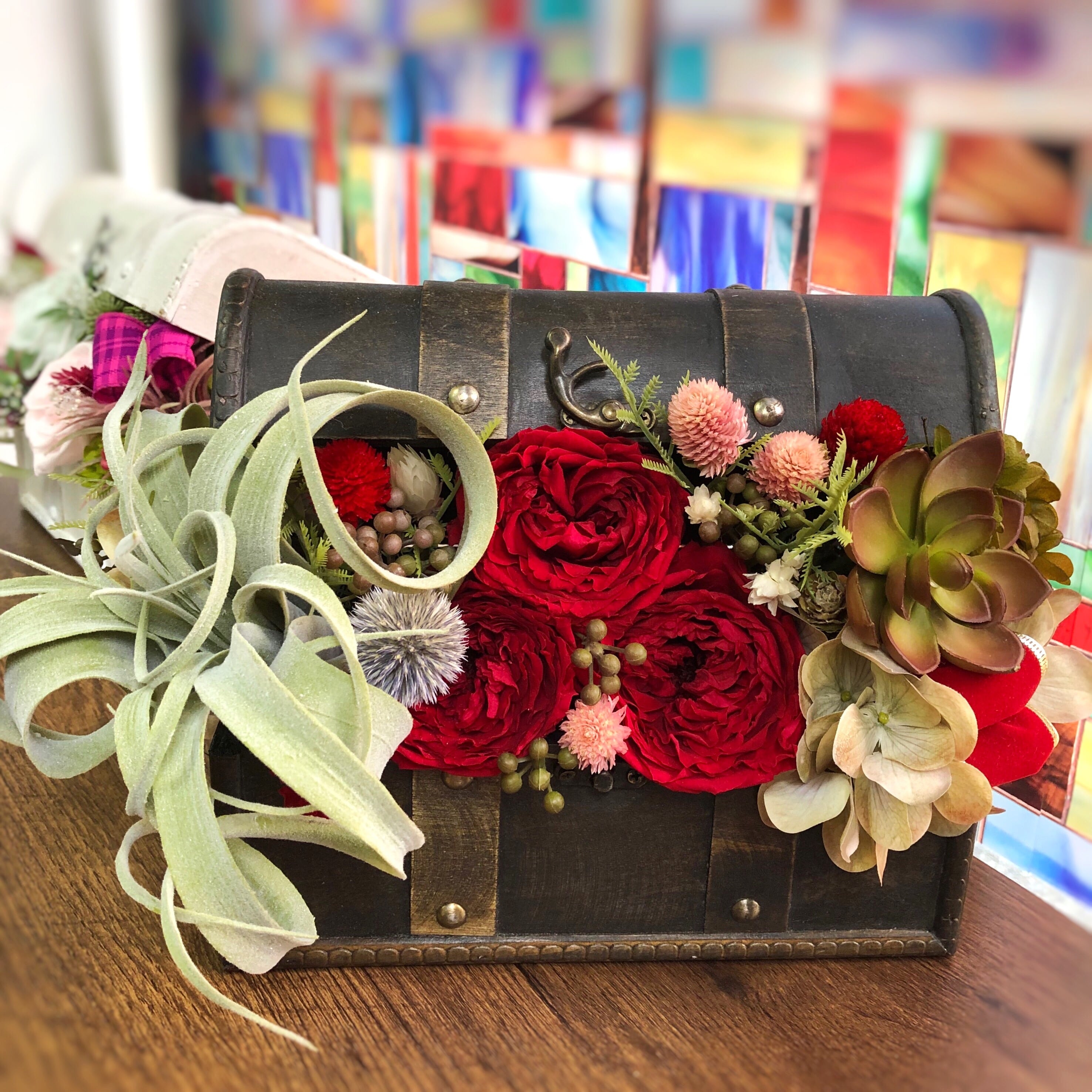 レッドのオールドローズのプリザーブドフラワーをメインに、アーティフィシャルの多肉植物やグリーン、ドライフラワー等を組み合わせた、まるで宝石箱のようなアレンジメントです。